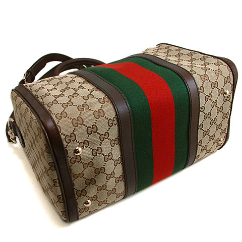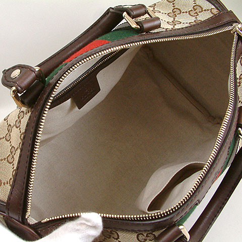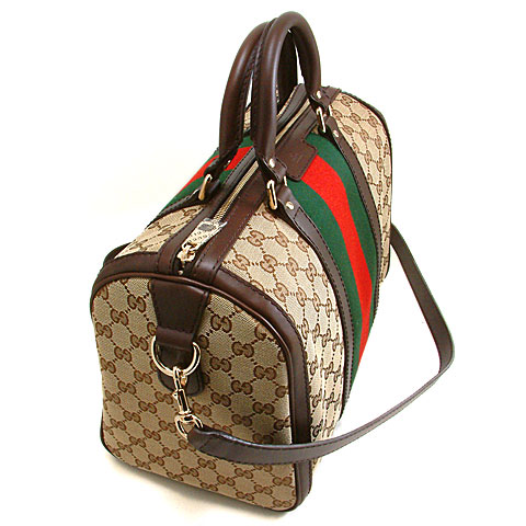 Gucci boston bag 247205 made of beige/ebony original GG fabric with green/red/green signature web and brown leather trim light gold hardware double handles with 9.5 cm drop adjustable and detachable shoulder strap with 50 cm drop zip-top closure interior zip and smart phone pockets medium size: W33cm x H22.5cm x D18cm.