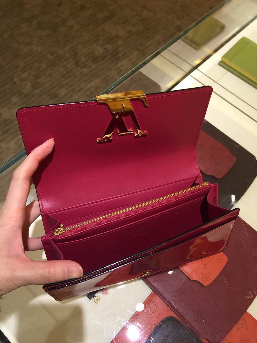 This modern and ultra-feminine long wallet in patent calf leather is instantly recognizable thanks to its iconic LV clasp. A very versatile wallet that can be worn as a clutch.